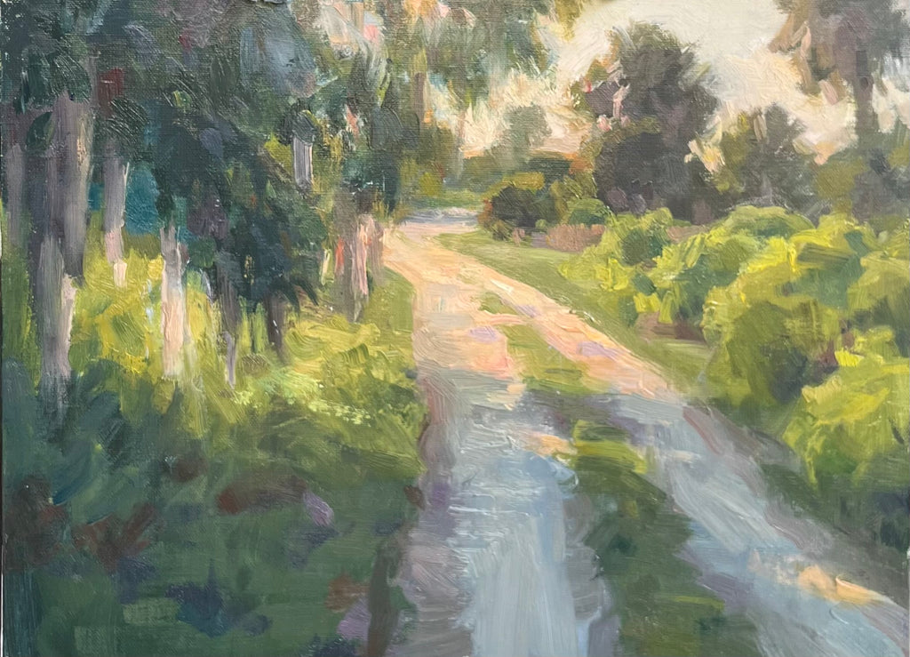 This piece was painted on location outside Darien in southern Georgia. I was finishing up for the day and drove past this beautiful view of the light shining through the trees. I turned around and went back and painted this scene and finished up just as the sun was setting below the horizon.