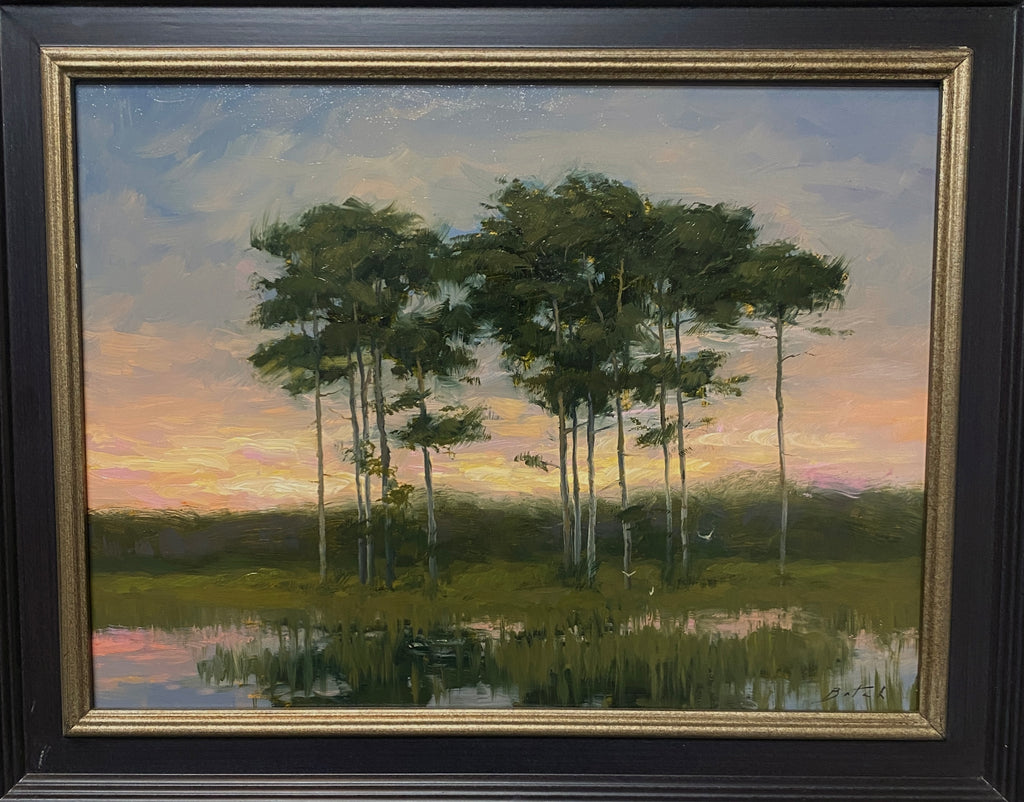 As dusk settled, the trees became silhouettes, their quiet forms holding the last whispers of light. The sky softened into muted violets and rose, tones that seemed to hum rather than shout. In Echoes of Evening, I wanted to capture that fleeting harmony -- when the world feels hushed, suspended between day and night.