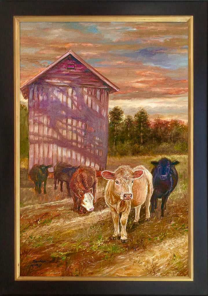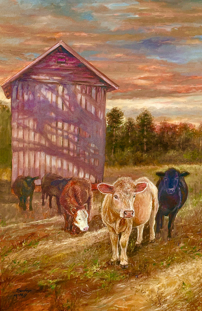 A group of five cows face the viewer with wide-eyed curiosity, with a dappled barn and hazy sunset sky above pines fill the background.