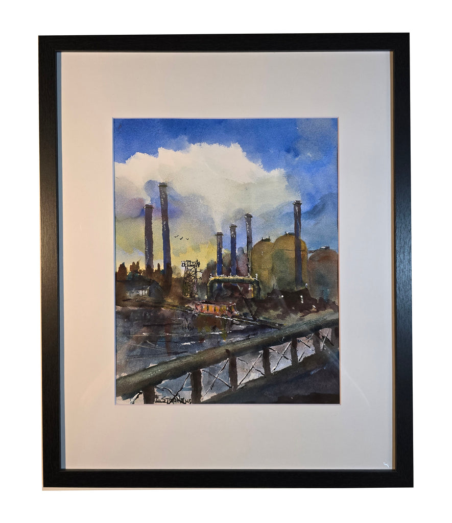 This watercolor painting of a steel mill and its nearby pond is called "Steel Water".