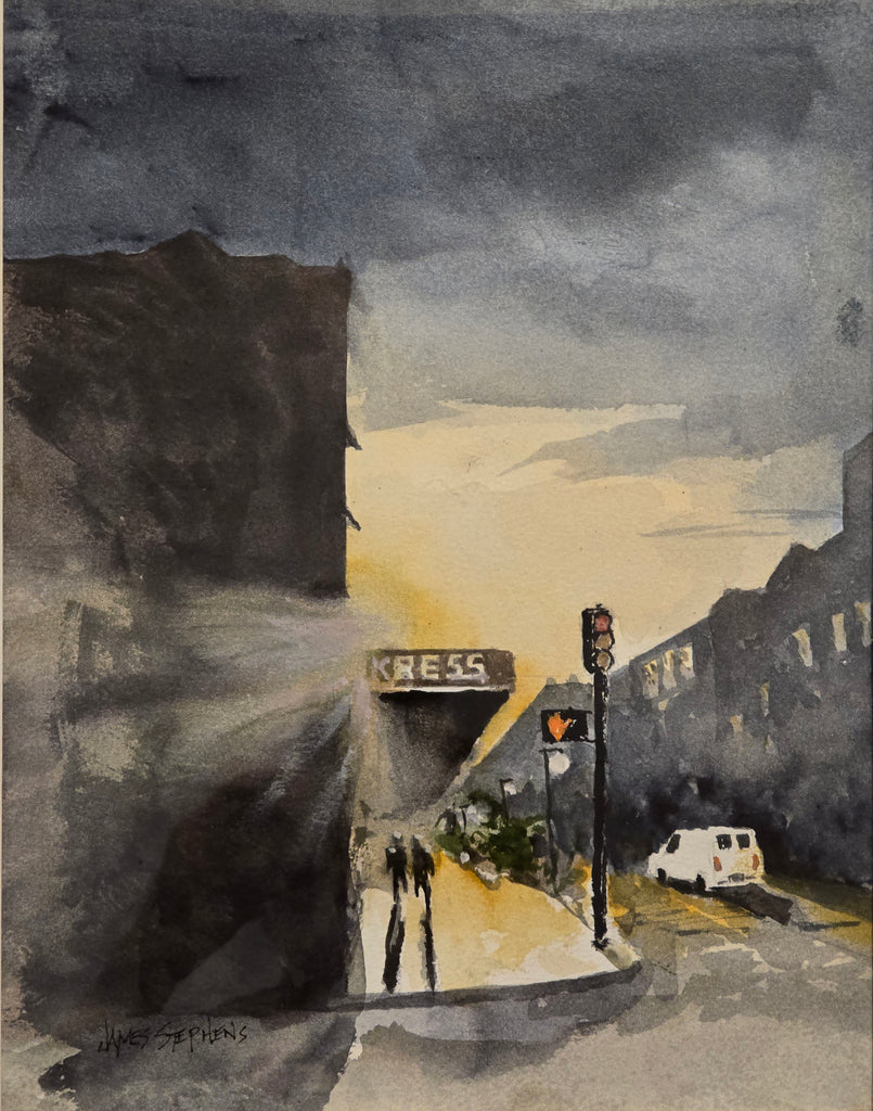 I was struck by this sunrise on Broughton Street in Savannah. The almost-blinding sunbeams flared out of the edge of the old Kress building, partially eliminating part of the name on the sidewalk canopy. I immediately stopped on the corner and began my painting.